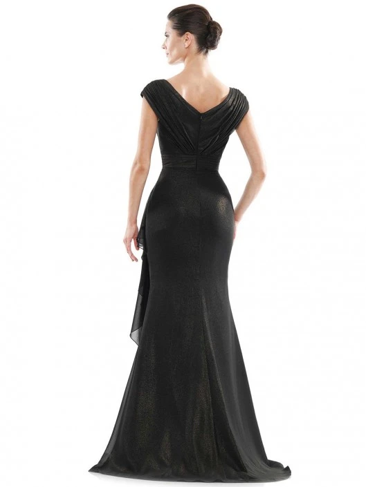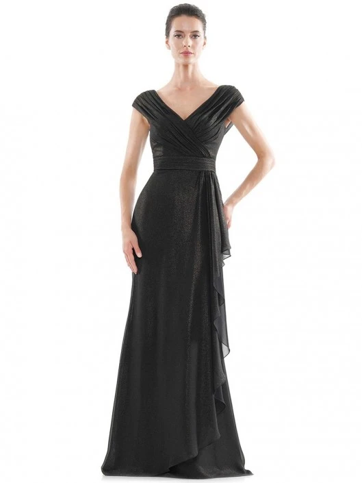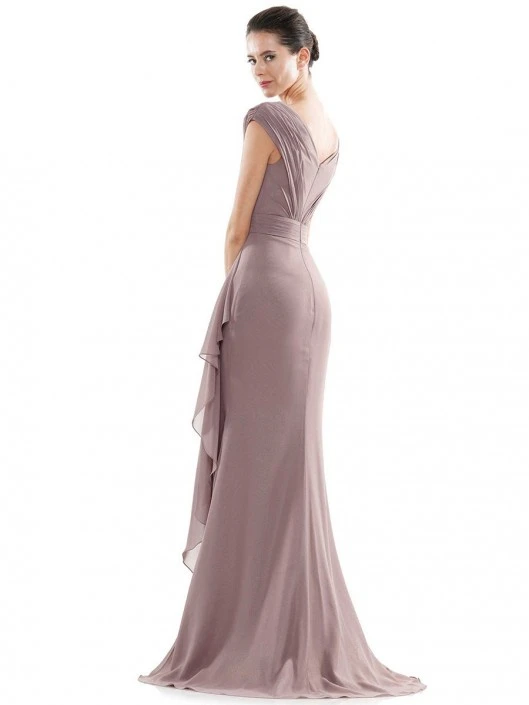 Style MV1073 from Marsoni by Colors is a tip of the shoulder foil chiffon V neck mother of the bride gown that has a soft asymmetrical overlay draped skirt and a V back.