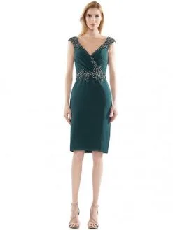 Style MV1107 from Marsoni by Colors is a cap sleeve fitted faille cocktail length mother of the bride dress with a pleated bodice and beading on the shoulder shoulders and waist.