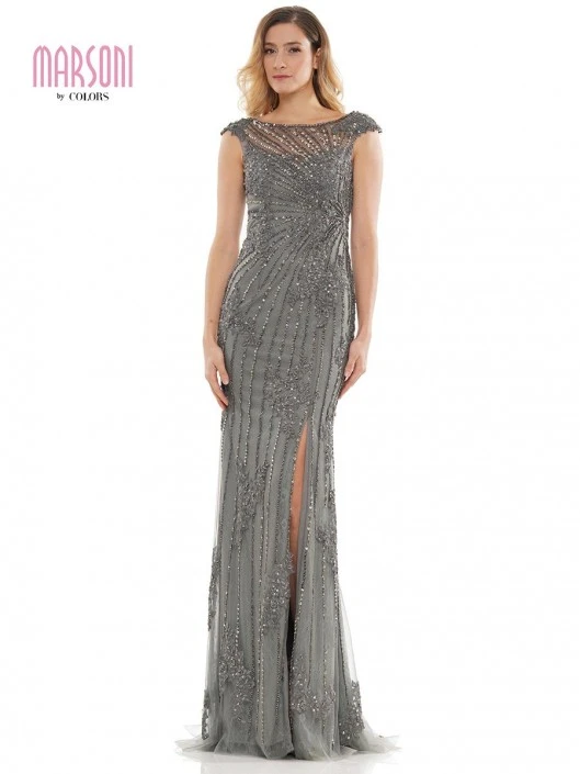 Style MV1128 from Marsoni by Colors is a beautiful cap sleeve mother of the groom gown with cascading bead and lace pattern over and a high slit.