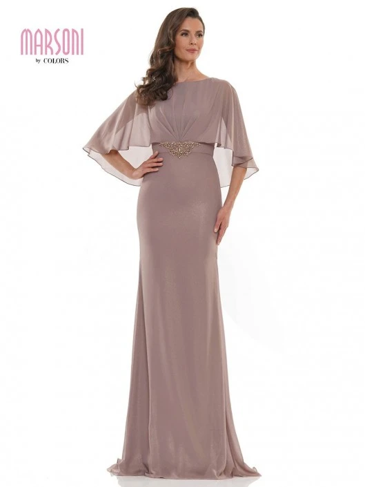Style MV1130 from Marsoni by Colors is a crew neck foil chiffon evening dress with cape style sleeves, softly beaded bodice overlay, and beaded belt. Elegant mother of the bride dress!