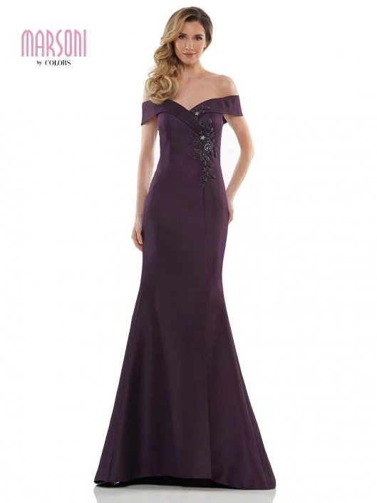 Style MV1140 from Marsoni by Colors is a off shoulder mermaid double faced satin evening gown with beading on the bodice.