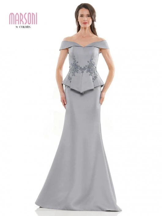 Style MV1141 from Marsoni by Colors is an off shoulder formal evening gown in double faced satin with peplum and beading.