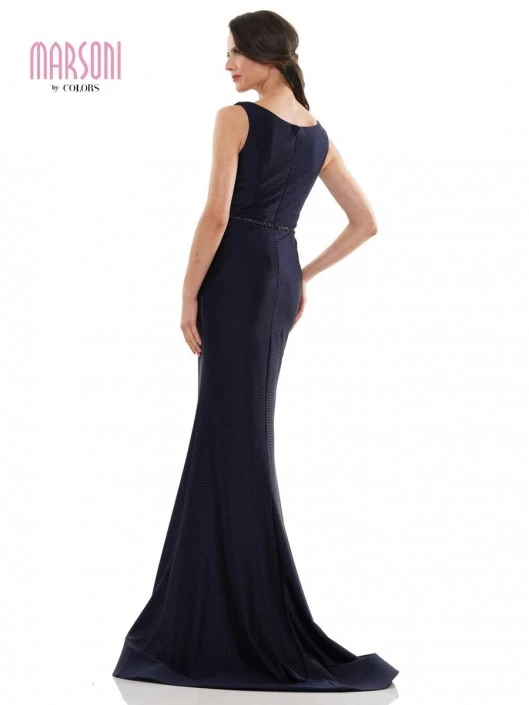 Style MV1152 from Marsoni by Colors is a sleeveless fit and flare gown with a V neckline in a herringbone novelty fabric.