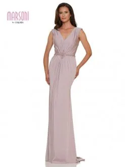 Style MV1157 from Marsoni by Colors is a sleeveless stretch faille mother-of-the-bride gown with a V-neckline, ruched bodice, embellished waistband, V-back, and a train.
