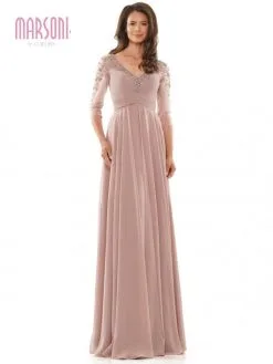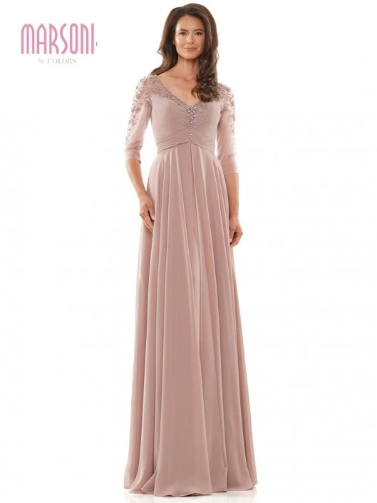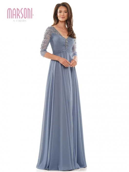 Style MV1171 from Marsoni by Colors is a chiffon mother-of-the-bride gown with a V-neckline, three-quarter sleeves, ruched bodice with embellishments, and a sheer closed back.