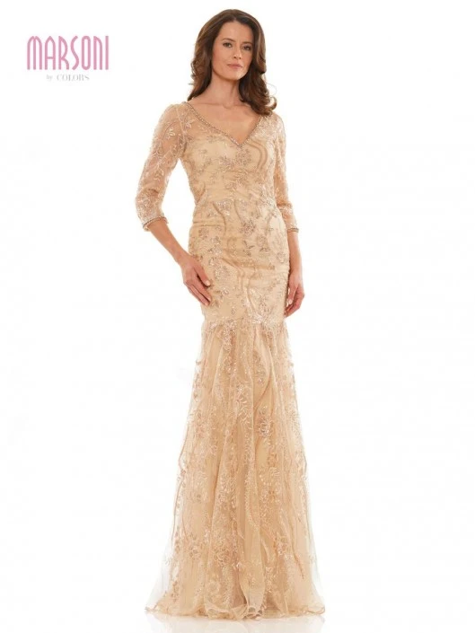 Style MV1193 from Marsoni by Colors is a V neck mother of the bride gown in a feminine beaded lace that has sheer three quarter sleeves in a fitted mermaid silhouette.