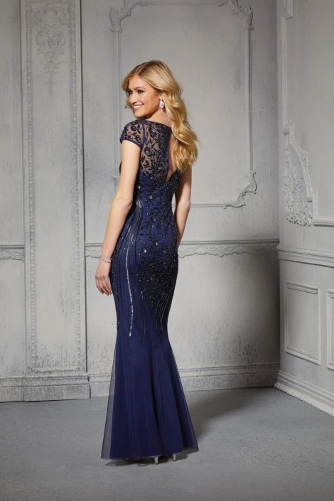 Style 72405 from MGNY by Morilee is a chic evening gown with a unique allover beaded design on a fitted sheath silhouette with cap sleeves, a crew neckline, and keyhole back.