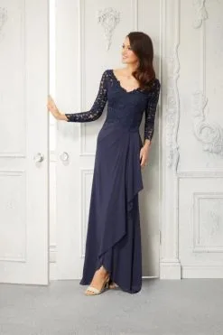 Style 72418 from MGNY by Morilee is a jersey split skirt mother of the bride gown with a delicately designed beaded lace V-neck bodice and sheer long sleeves. A tulip hem and asymmetrical overlay create movement and flow on the skirt.
