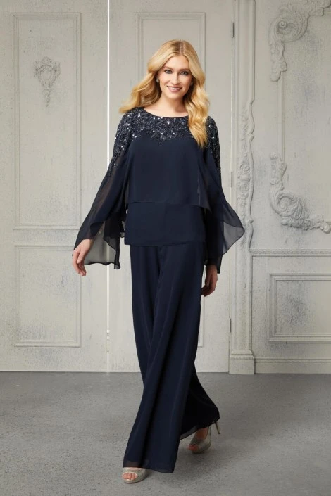 Style 72428 from MGNY by Morilee is an effortless two-piece chiffon pant suit with a sparkling beaded neckline on the fluttering attached capelet and flowing wide-leg pants.