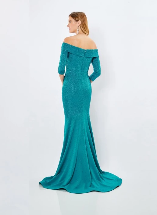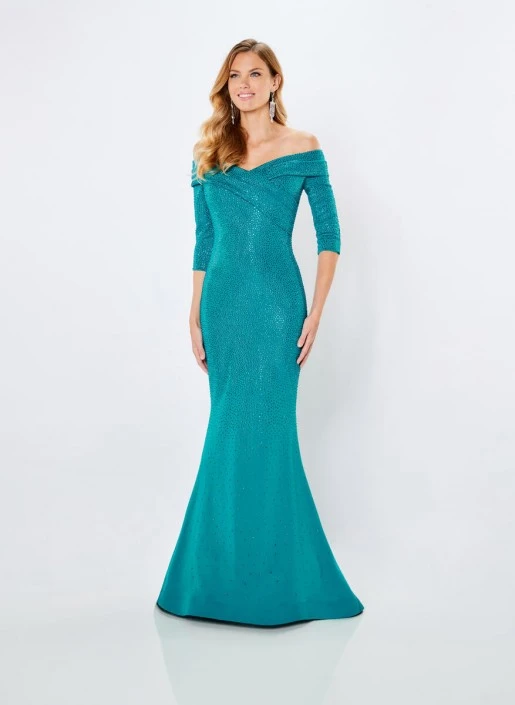 Style 221970 from Montage by Mon Cheri is a sleek fit and flare gown featuring a v-neckline, off-the-shoulder three quarter sleeves, high-back, and a sweep train. The dress is a heavy jersey with stone accents scattered throughout, stylishly elegant for any special occasion.