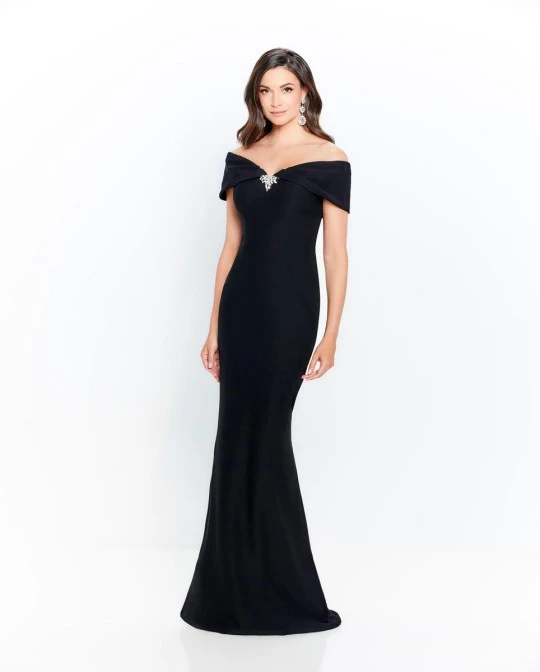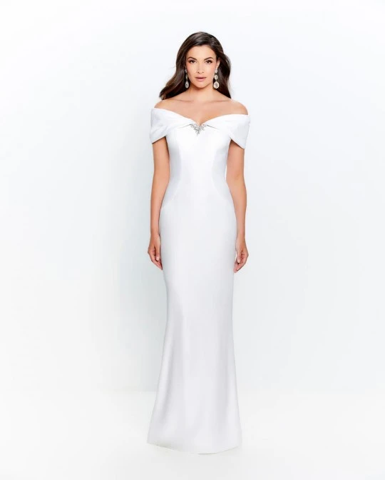 Style 120905 from Montage by Mon Cheri is an off-the-shoulder stretch crepe gown that has a pleated V-neckline with beaded brooch, fold-over back detail, and a trumpet shaped skirt with button at the low center back to bustle the sweep train. Matching stretch crepe shawl included.