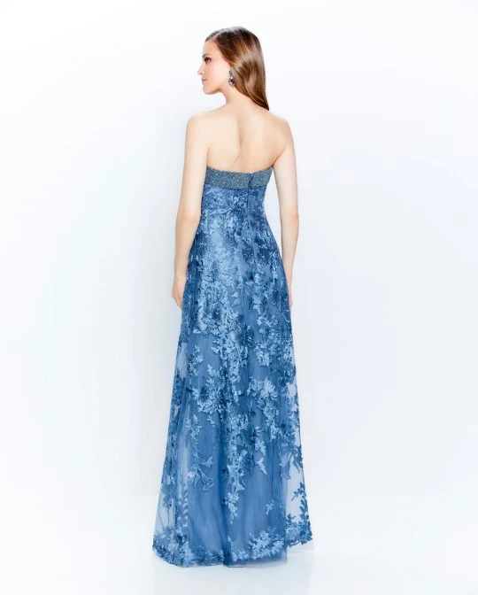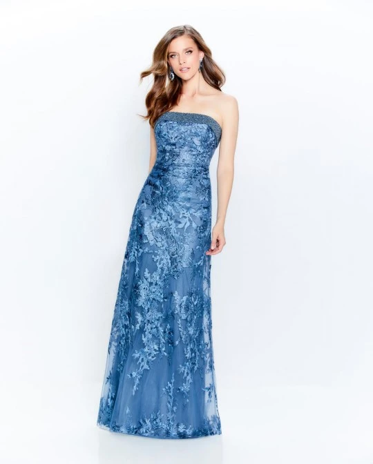 Style 120920 from Montage by Mon Cheri is a strapless embroidered lace fit and flare mother of the bride gown that has a straight neckline with heavily beaded trim, natural waistline, and soft flare in the skirt. Detachable straps and matching tulle shawl included.