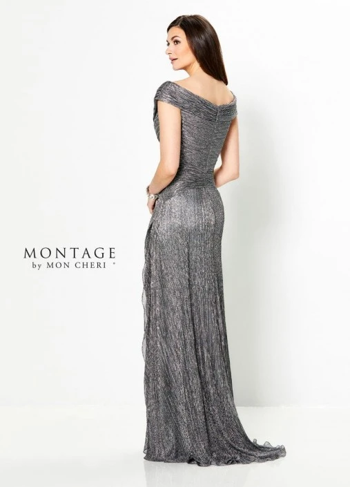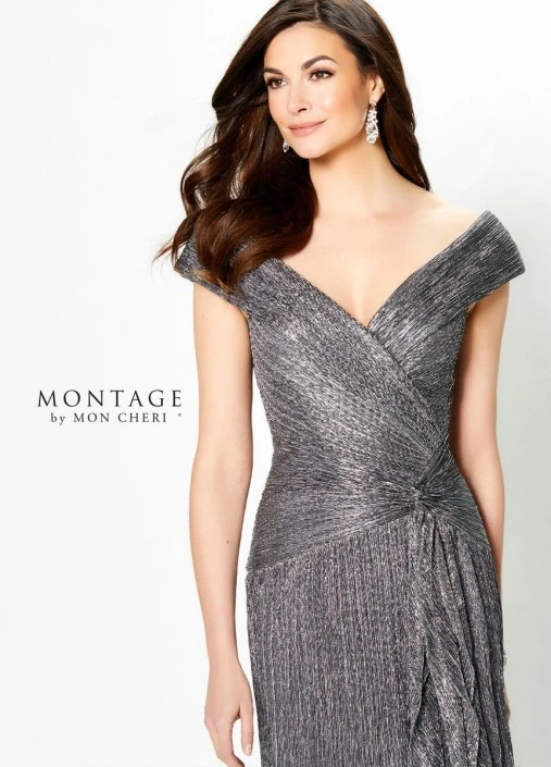Style 219975 from Montage by Mon Cheri is a novelty stretch sheath mother of the bride gown that has cap sleeves, a wide V-neckline with a portrait collar, an asymmetrically ruched bodice, a dropped waistline, side cascading ruffles, and a sweep train.