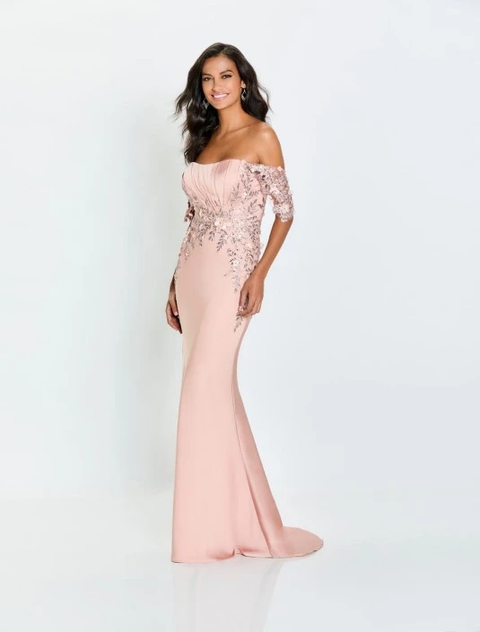 Style M521 from Montage is an off-the-shoulder satin mother-of-the-bride gown with a sweetheart neckline on the pleated bodice, elbow length floral illusion sleeves, fit-n-flare silhouette, an open back, and a train. Floral embroidery adorns the bodice, waist, and trials down the hips. Separate spaghetti straps and a shawl are included.
