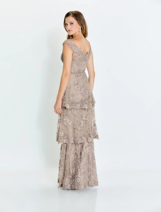 Style M526 from Montage is an embroidered tulle mother-of-the-bride gown with a V-neckline, cap sleeves, V-back, belted waist, and a tiered layered skirt.