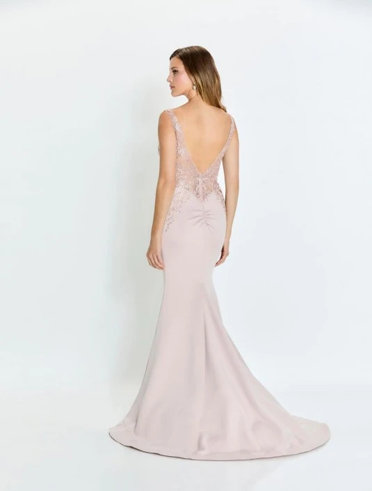 Style M528 from Montage is a sleeveless stretch crepe evening gown that has a plunging V neckline with mesh insert, an open sheer V-back, a train, and a separate shawl. Lace accents the bodice and hips of this beautiful gown.