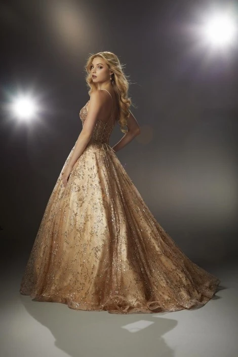 Style 48017 from Morilee by Madeline Gardner is a grand ball gown for prom featuring dazzling beaded lace appliques on shimmering pattern glitter net with a plunging V neckline and spaghetti straps that cross in the back over a lace-up corset.