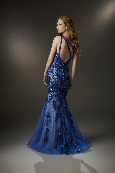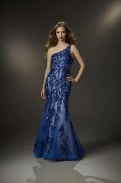 Style 48025 from Morilee by Madeline Gardner is a dazzling mermaid prom gown that sparkles with crystal beaded patterned sequins accented by delicate embroidery on glitter tulle for the extra pop of bling. The one-shoulder neckline is totally chic and leads to a cool strappy back.