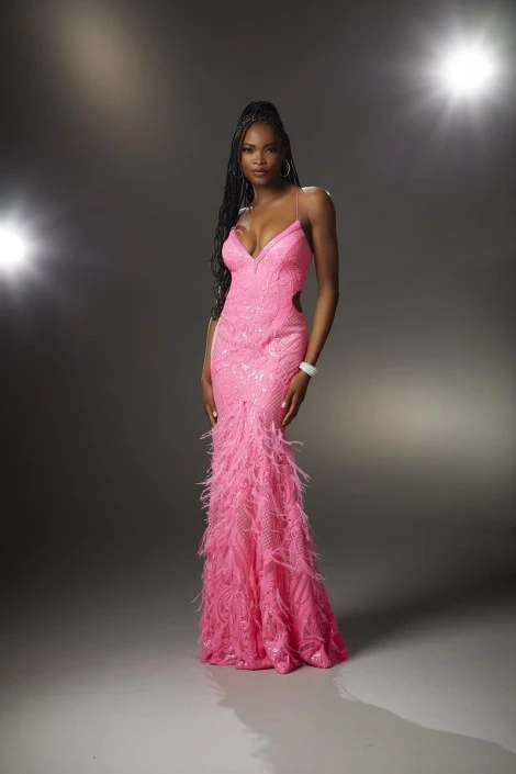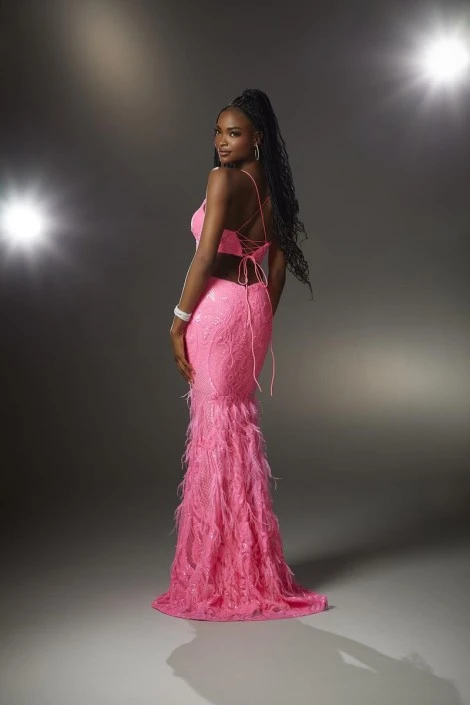 Style 48039 from Morilee by Madeline Gardner is a fierce intricate patterned sequin prom gown with bold beaded trim on the deep V neckline leading to a lace-up back with low back cut-out. The accent of feathers on the skirt are a fab touch to stand out at prom.