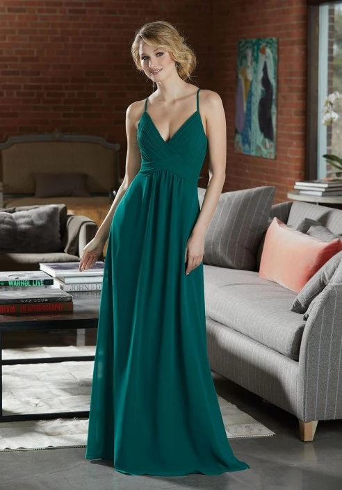 Style 21586 from Morilee is a spaghetti strap chiffon bridesmaid dress with a sophisticated V-neck neckline and crossover pleated bodice. The A-line silhouette and crossover back straps with cut out compliment the design of this long gown.