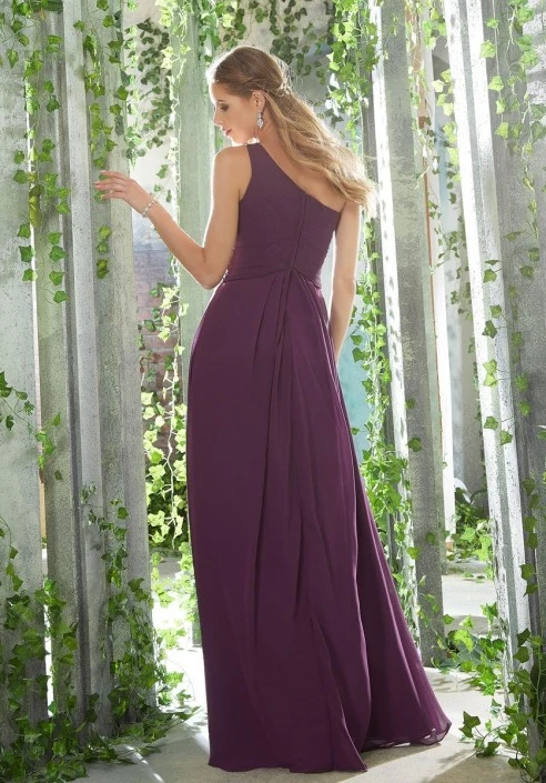 Style 21619 from Morilee is an Elegant Bridesmaid Gown that has a One Shoulder Draped Bodice and Flowy A-Line Chiffon Skirt.