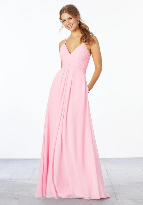 Style 21658 from Morilee Madeline Gardner is a chiffon A-line bridesmaid gown with a pleated V-neck empire bodice, spaghetti straps, and a beautiful ruched keyhole back.
