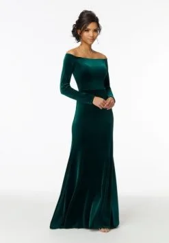 Style 21724 from Morilee is a luxurious stretch velvet bridesmaid gown with a straight off-the-shoulder neckline and long sleeves. A matching waistband helps define your figure.