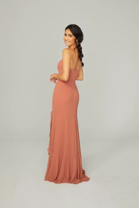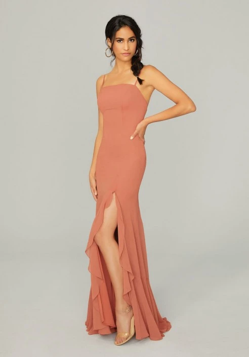 Style 21752 from Morilee is a flirty chiffon bridesmaid gown with a chic square neckline, spaghetti straps that create a V-shaped back, and fun ruffled front skirt slit.