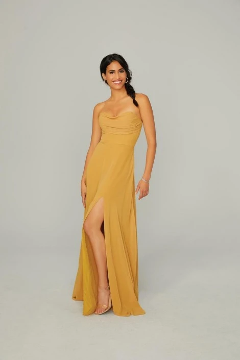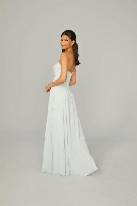 Style 21766 from Morilee is an effortless chiffon bridesmaid gown with a gorgeous draped strapless sweetheart neckline and front skirt slit.