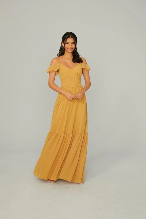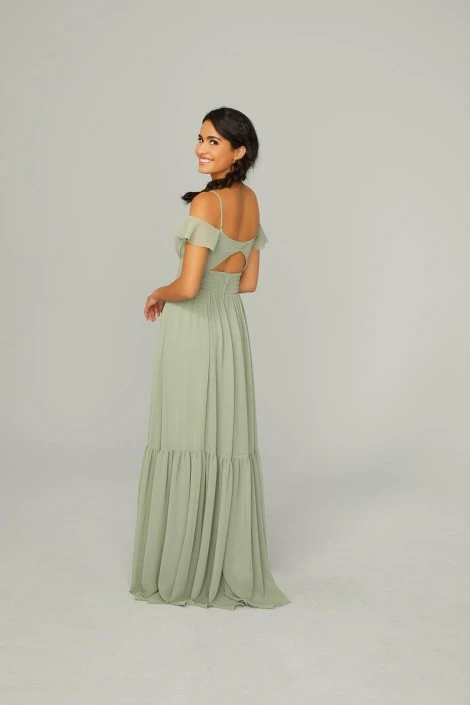 Style 21768 from Morilee is a boho chiffon bridesmaid gown that has a sweetheart neckline, ruffled cold-shoulder draped sleeves, and keyhole back. The ruched waist cinches you in and the tiered skirt has that free-spirit feel.