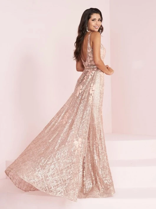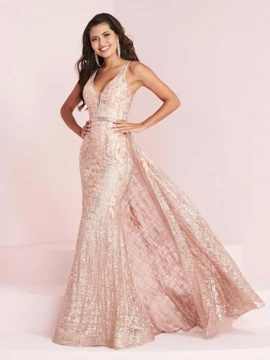 Style 14019 from Panoply is a cracked ice gown that features a V neckline, beaded belt, a trumpet skirt, and a back overskirt, all decorated with matching 3D flowers.