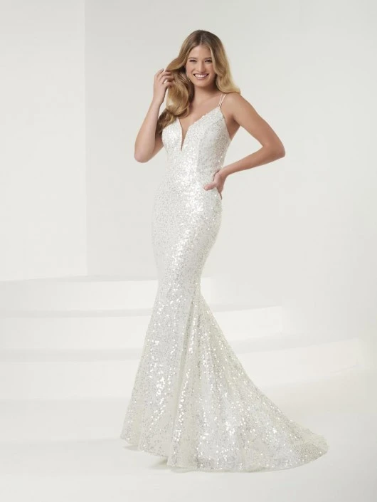 Style 14089 from Panoply is a shimmering iridescent sequin prom gown with a low back and deep sweetheart neckline that has an open lace up back and train.