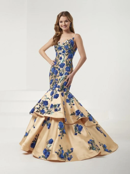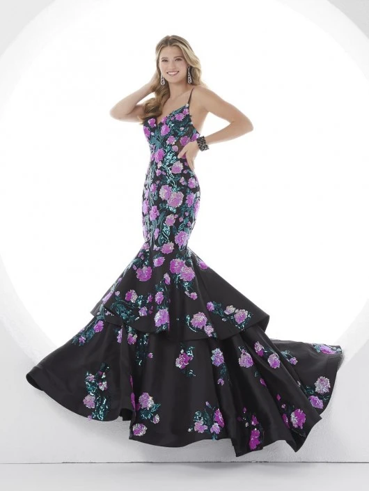 Style 14095 from Panoply is a beautiful satin mermaid prom gown with a fitted sweetheart bodice covered in sequin roses, a two-tiered mermaid skirt, and a train.
