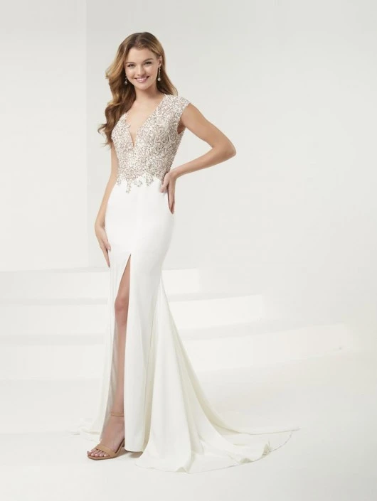 Style 14117 from Panoply is a truly stunning formal gown. This V neck is made of rhinestone lace and has cap sleeves and a back cut out. The stretch satin fitted trumpet skirt has a side front slit and a train.