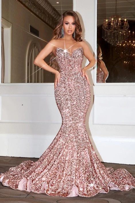 Style PS21208 from Portia and Scarlett is a strapless sequin prom gown with a deep sweetheart neckline with mesh insert, mermaid silhouette, open back, and a train.