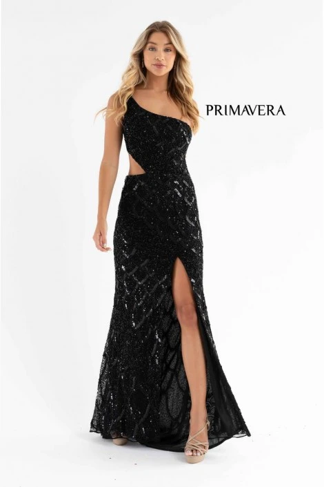Style 3729 from Primavera Couture is a one-shoulder evening gown with an asymmetrical neckline, side cut-out bodice, beading, thigh high front slit, and a train.