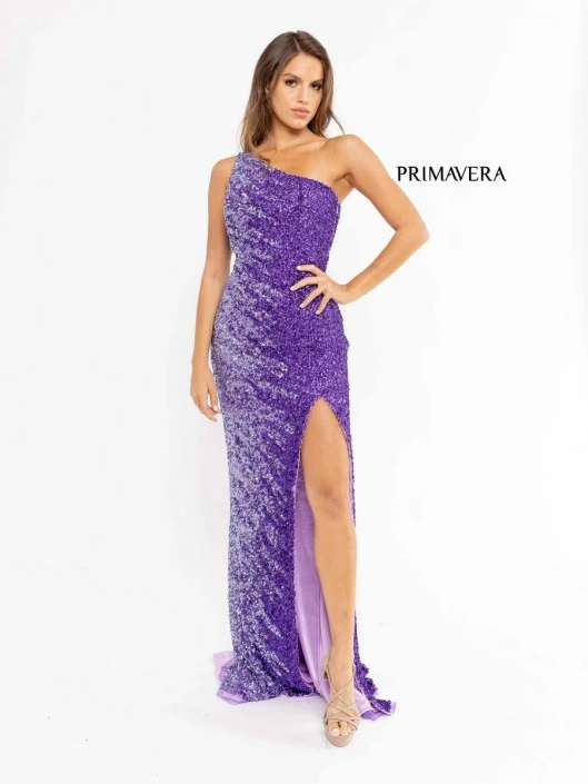 Style 3944 from Primavera Couture is a one-shoulder beaded prom gown with an asymmetrical neckline, fitted silhouette, thigh high front slit, and a train.
