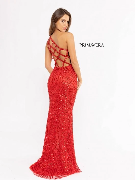 Style 3951 from Primavera Couture is a one-shoulder prom gown with an asymmetrical neckline that features beading, fitted silhouette, strappy open back, thigh high front slit, and a train.