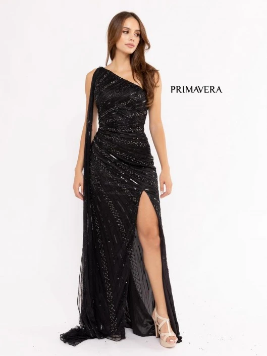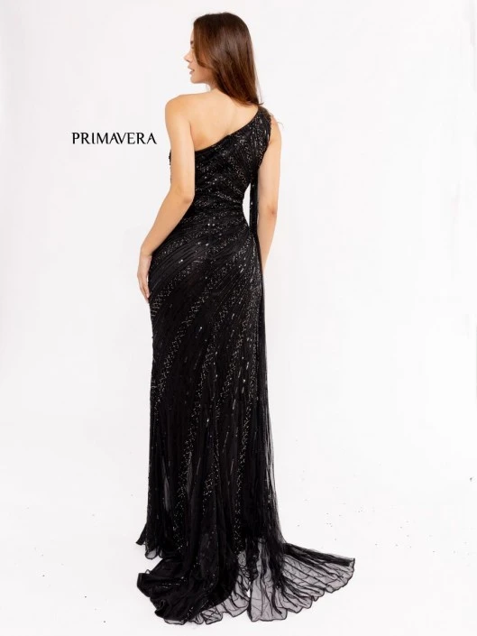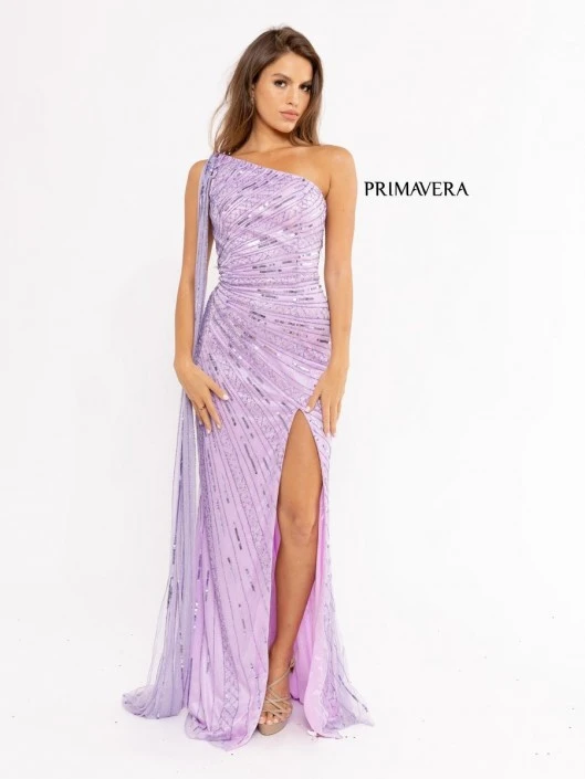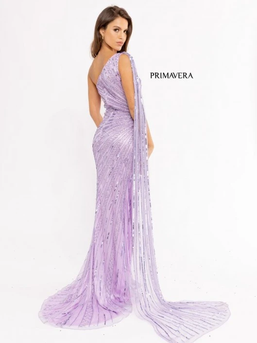 Style 3956 from Primavera Couture is a one-shoulder evening gown with a shoulder float, asymmetrical neckline, beaded designs, thigh high front slit, and a train.