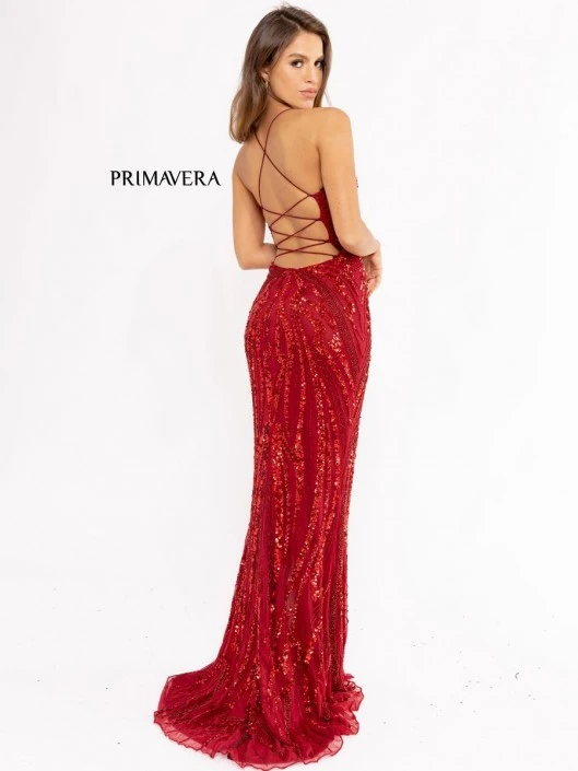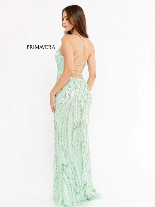 Style 3958 from Primavera Couture is an evening gown with a V-neckline, embellished bead designs, fitted silhouette, thin straps that criss-cross in a deep open back, and a thigh high front slit.