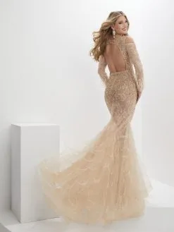Panoply By House Of Wu Panoply 14153 Sheer Long Sleeve Beaded Feather Gown