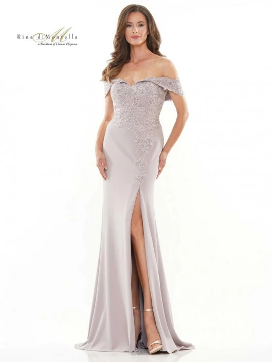 Style RD2728 from Rina Di Montella is an off shoulder draped sleeve mother of the bride gown in stretch crepe. This gown features an embroidered fitted bodice and skirt slit.
