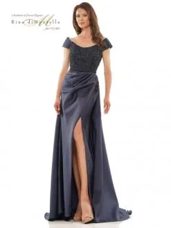 Style RD2815 from Rina Di Montella is a tip of the shoulder cap sleeve mother of the bride gown in dupioni fabric with a scoop neckline on the beaded bodice. The draped A-line skirt has a slit.