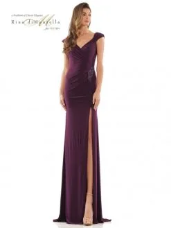 Style RD2824 from Rina Di Montella is a cap sleeve matte jersey mother of the bride gown with a V neck on the surplice bodice and a high skirt slit. A jeweled accent sits on one side of the waist and a V back completes this elegant look.
