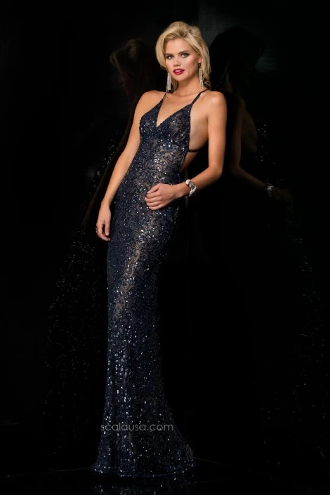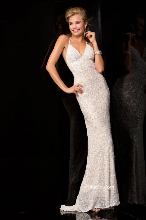 Feel like a goddess at your next big event with this dramatic floor length evening gown by Scala. Fitted throughout, this fully beaded gown hugs your curves in shimmering elegance that is sure to turn heads. The dramatic plunging neck and back line add drama and elegance as tone on tone beading allows for the optimum amount of shimmer and shine. Perfect for prom, pageants, and other formal events this gown is sure to make a statement making it a must have for your formal wear wardrobe. Available for order in Ivory, Navy/Nude, Charcoal, and Port to satisfy all of your formal wear needs.