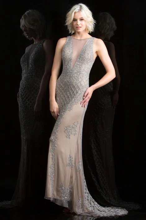 Style 48787 from Scala is a sleeveless beaded fitted evening gown with a sheer front cut out and an open back.