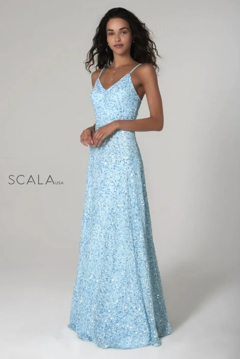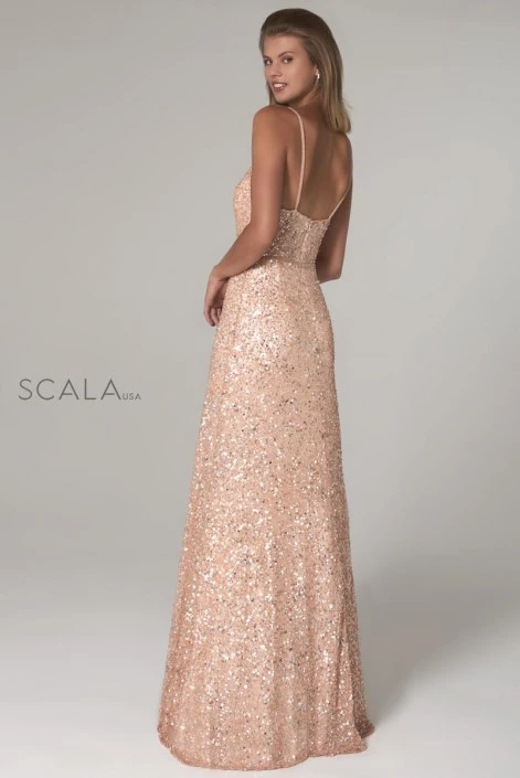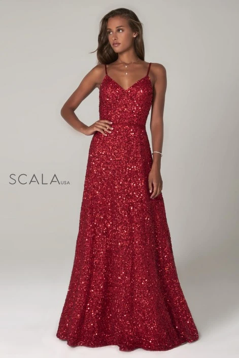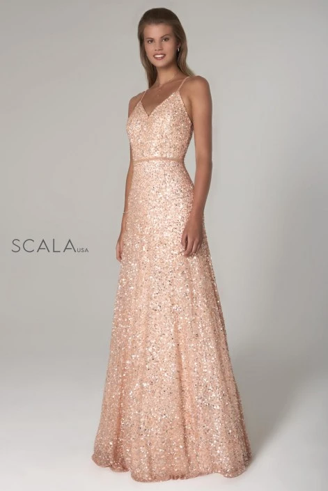 Style 60109 from Scala is a sequin A-line gown with a V neck and spaghetti straps.
