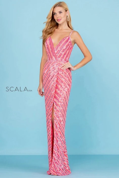 Style 60258 from Scala is a diagonally beaded evening gown featuring a wrap style dress, V-neckline, narrow straps, beaded belt, scoop back, and a thigh high front slit.