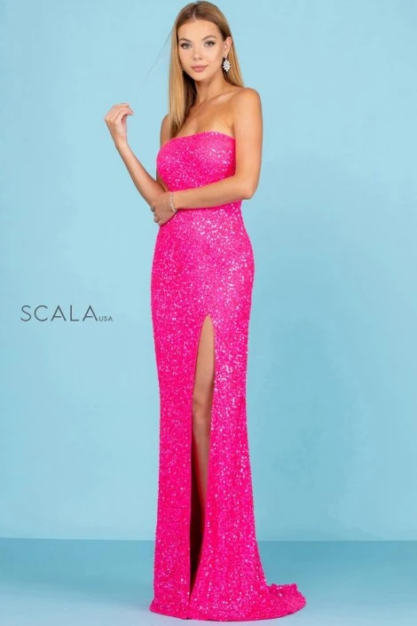 Style 60291 from Scala is a strapless sequin prom gown with a thigh high front slit and a sweep train.