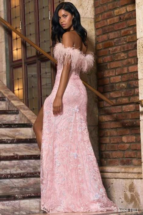 Style 55201 from Sherri Hill is a show stopping sheer corset gown with feathery off shoulder draped sleeve and a high slit skirt with sweep train.